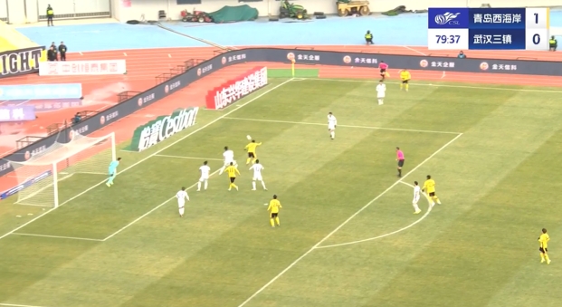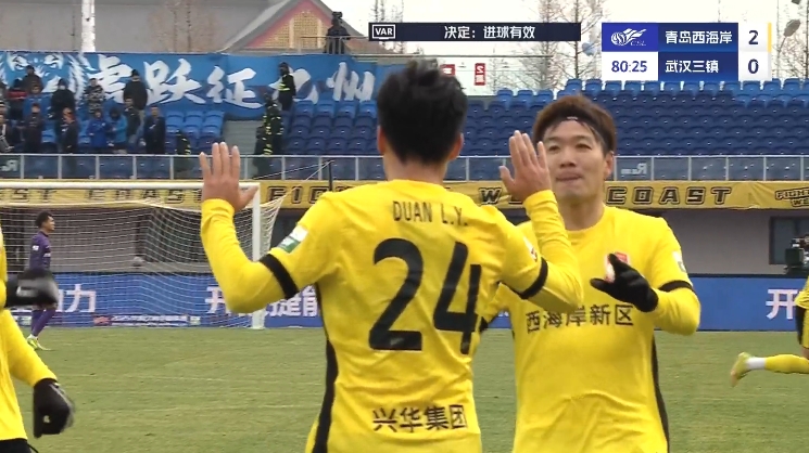 03月03日讯 中超联赛第2轮,昨日因天气原因延期的青岛西海岸vs武汉三镇的比赛继续进行。西海岸右路过顶长传,高迪头球中柱后,段刘愚补射得手,西海岸2-0锁定胜局。 标签: 足球 中超 中国足球 青岛西海岸