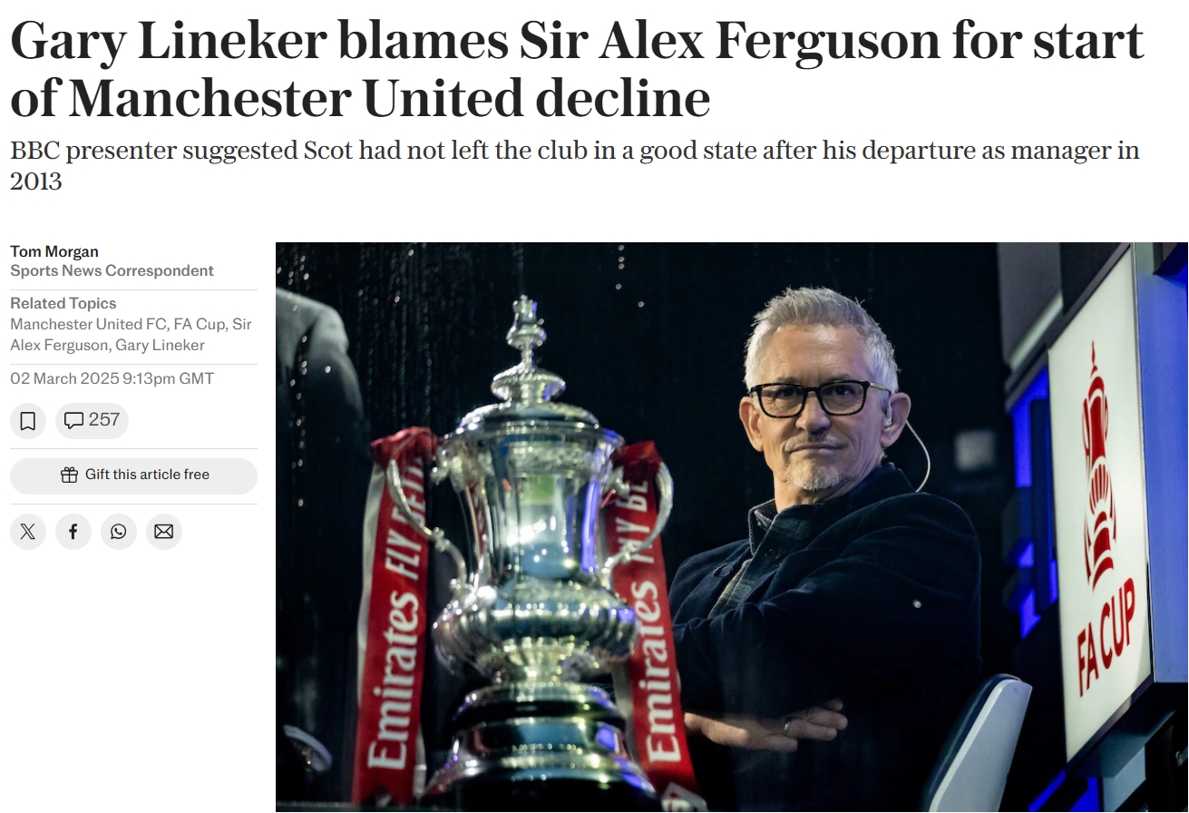 03月03日讯 英格兰名宿、评论员莱因克尔在评述时表示,曼联如今衰落的原因可以追溯到2013年弗格森的离任。