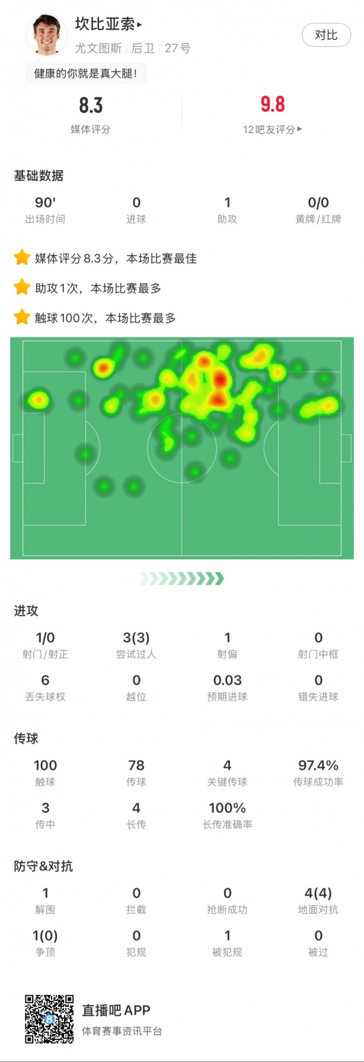 3月4日讯 意甲第27轮,尤文2-0维罗纳。坎比亚索本场数据: