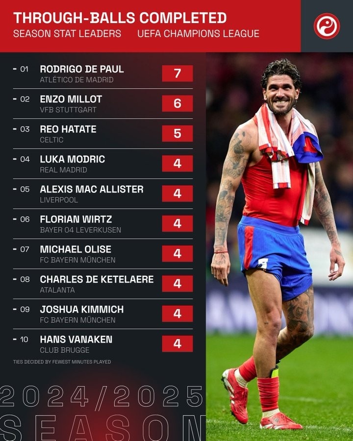 3月4日讯 欧冠十六强战即将战火重燃,数据机构squawka统计了本赛季欧冠精准直塞情况,德保罗居首。