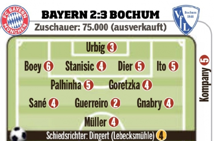 3月9日讯 拜仁在本轮德甲2-3被波鸿逆转,《图片报》在赛后按照惯例进行了评分,博伊被打出象征灾难级的6分。